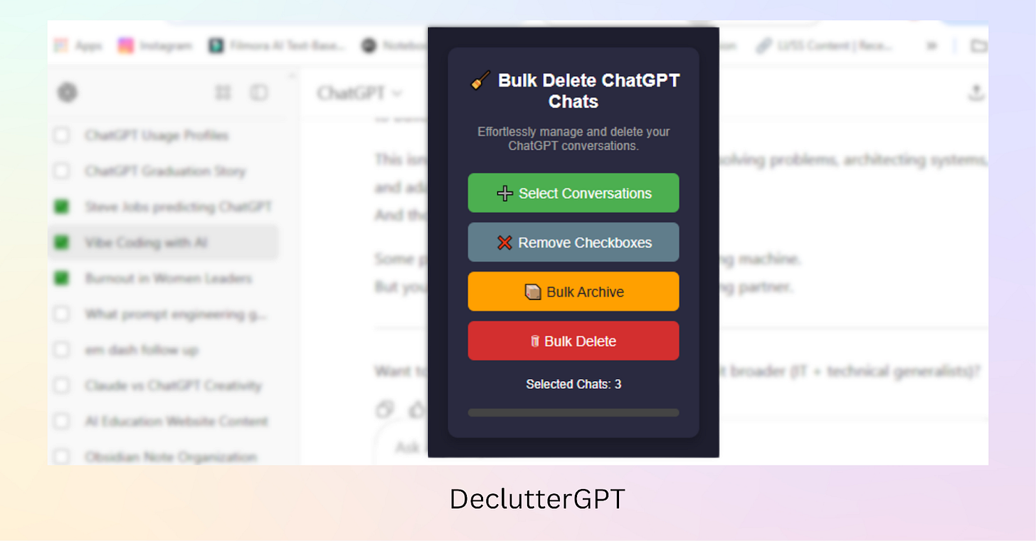 I came across this little gold nugget a while back when my chats were completely out of control because I had never cleaned them out. I downloaded the free Declutter GPT tool from the Chrome store and cleared my entire random chats list in an incredibly short time.